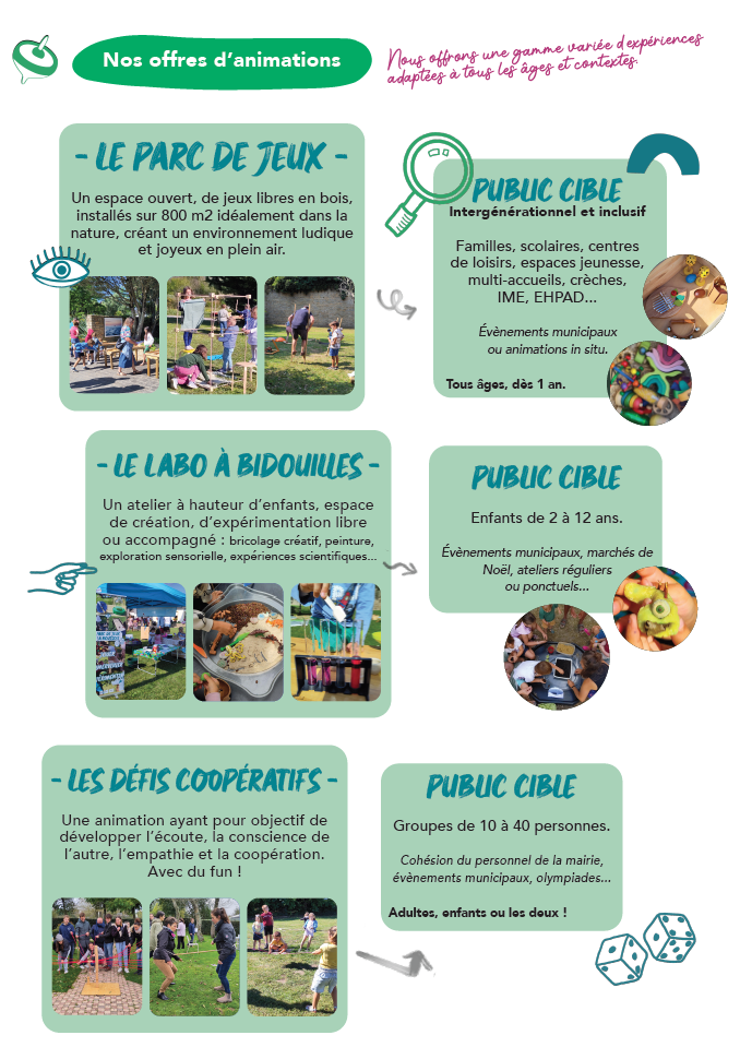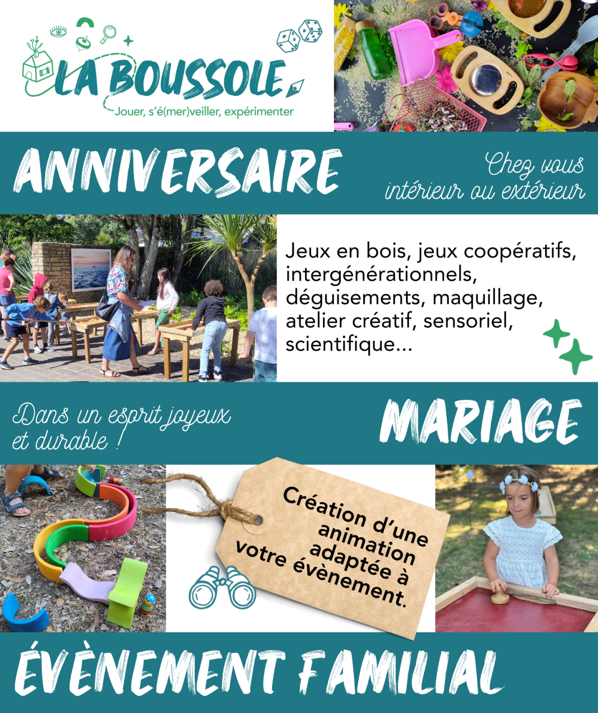 La Boussole a pour vocation d'animer des évènements de toute nature et surtout de donner à l'enfant une place de choix. Des animations intergénérationnelles et pour des groupes d'adultes sont également proposées. Découvrez la brochure des offres et contactez-nous pour un devis personnalisé.